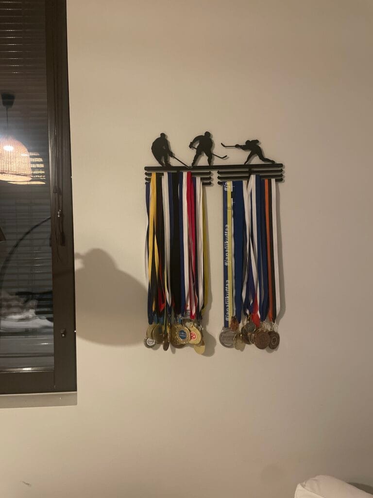 Näytä rakkautesi jääkiekkoon: Tämä mitalihenkari ei ole vain mitalien näyttämistä varten; se on myös taideteos ja tyylikäs sisustuselementti, joka tuo esiin jääkiekon vauhdin ja joukkueurheilun hengen. Olitpa sitten pelaaja, fani tai yhteisön jäsen, tämä mitalihenkari tekee huoneestasi vaikuttavan keskipisteen.