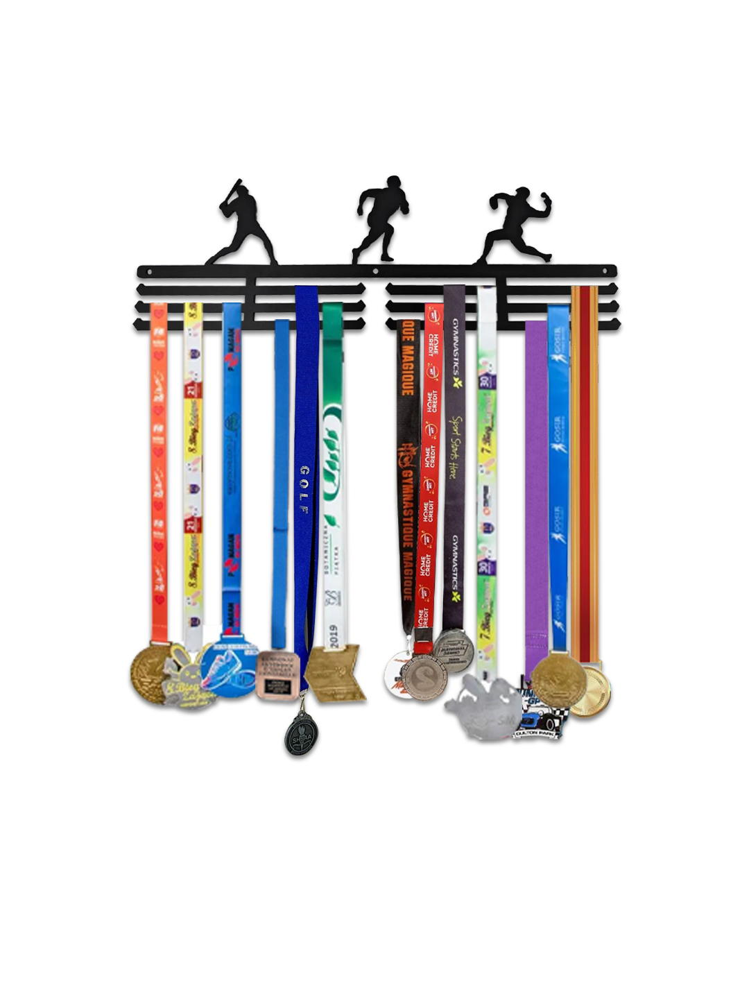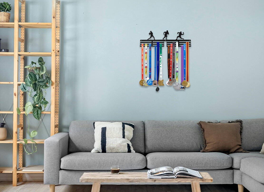 Henkari tarjoaa kolme ripustustasoa, yhteensä noin 120 cm säilytystilaa, joten siihen mahtuu helposti yli 100 mitalia – turnausmitaleita, sarjamitaleita, palkintomitaleita ja viirejä.