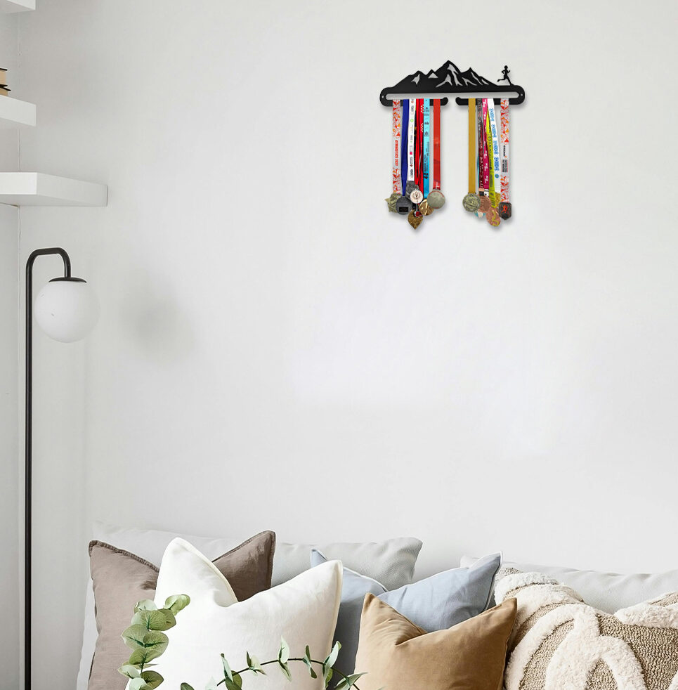 polkujuoksu mitaliteline, vuorijuoksu mitalihenkari, trail running medal hanger, trail juoksu sisustus, mitaliteline polkujuoksijalle, lahja polkujuoksijalle, teräksinen mitalihenkari juoksu