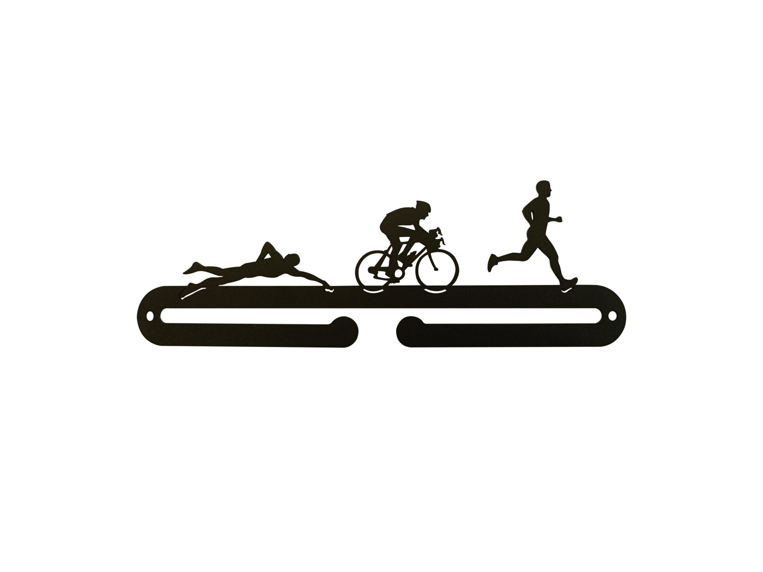 Tyylikäs teräksinen mitalihenkari kaikille triathlonin harrastajille. Valmistettu korkealuokkaisesta teräksestä ja maalattu käsin tyylikkään mustaksi. Perusmallin leveys noin 26 cm. Saatavilla myös noin 43 cm kokoinen jättimalli, missä on ripustustilaa kolmessa tasossa sekä paikat omien ennätysten merkintään.