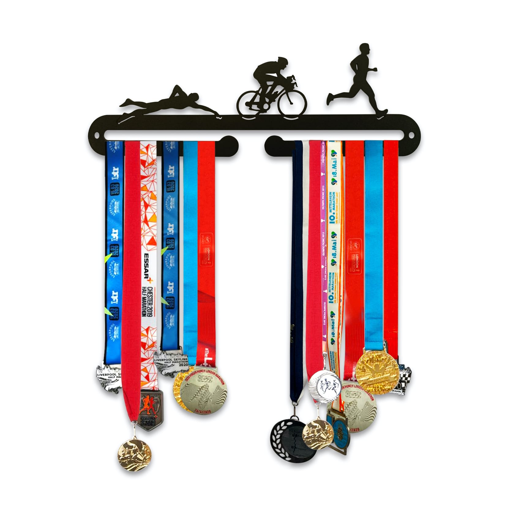 Näytä Rakkauttasi Triathloniin: Tämä mitalihenkari on voimakas symboli triathlonin monipuolisuudesta ja yhteisestä päämäärästä. Se ei ainoastaan esittele triathlon-mitaleita, vaan myös kertoo tarinan monipuolisuudesta ja voiton makuisista hetkistä.